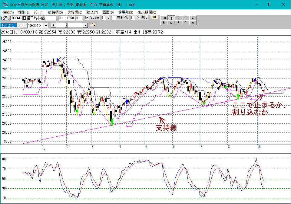 2018年09月10日 日経平均、ここで止まるか、割り込むか こうした支持線を引く場合、目分量で引くのではないでょうか?それでは、自分にとって都合のいい感じに引いてしまいも結局は後付け。やっばりあのときは・・・うんぬん・・・となるのでは。こういう線は、ルールを決め、自動でプログラムに引かせるべきです。あくまでも機械的に。JP法のソフトは自動で引かせるようになっています。 147.日柄転換線+トレンドライン 「株ソフト」カテゴリの最新記事 タグ :株ソフト < 前の記事次の記事 > コメント コメントフォーム 名前 メール URL コメント 評価する リセット リセット 顔 星 投稿する 情報を記憶